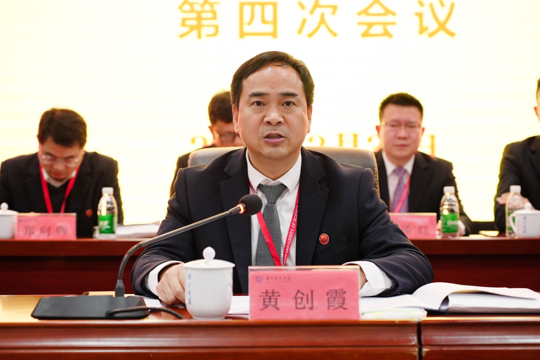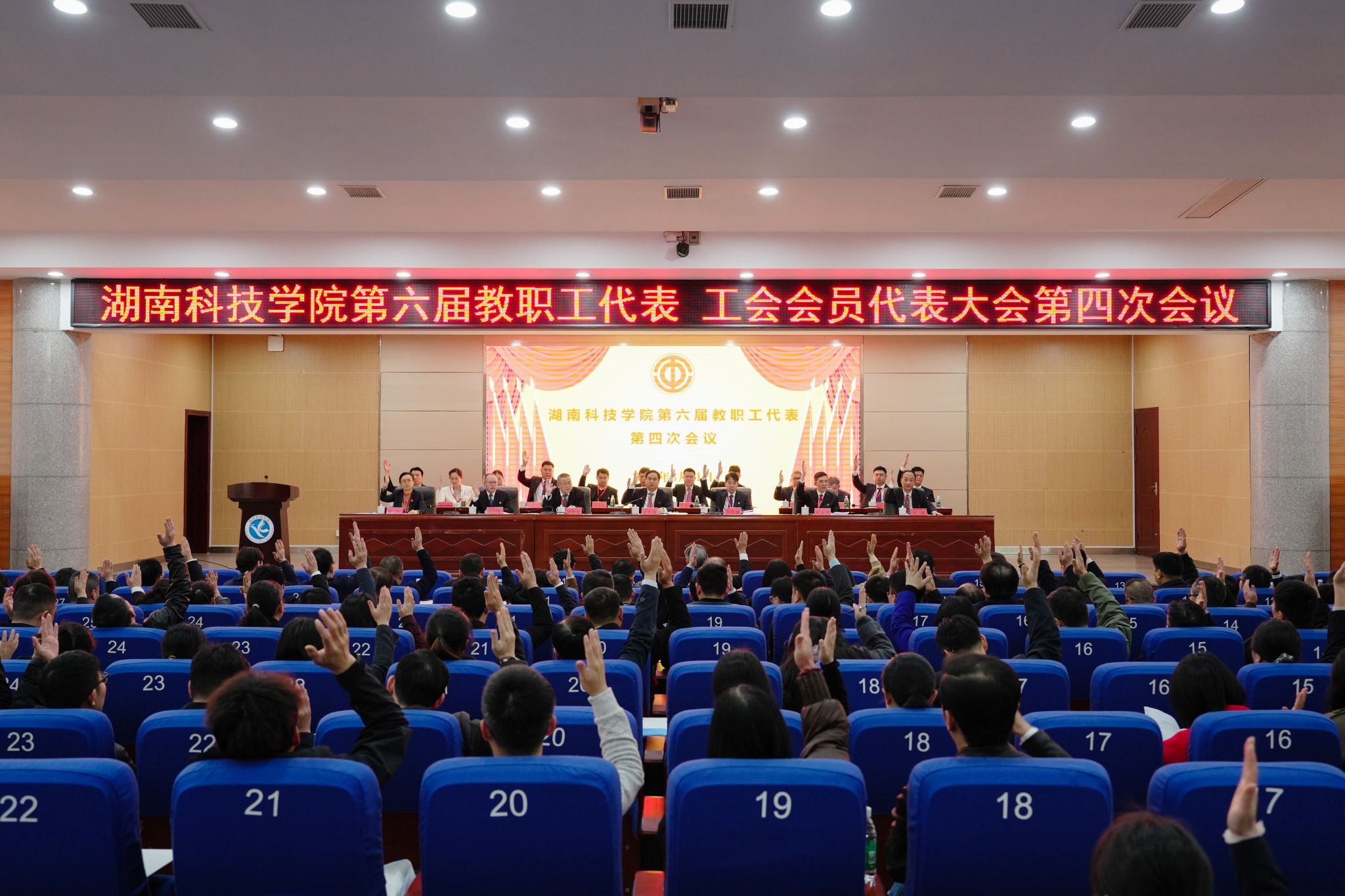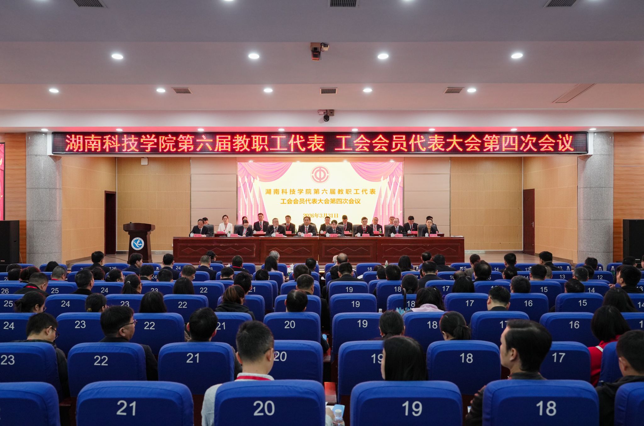 本网讯(记者 向薛峰 摄影 谢志豪)3月31日,我校第六届教职工代表、工会会员代表大会第四次会议在潇湘大讲堂召开。校党委副书记、校长黄创霞等全体校领导,全体代表、特邀嘉宾和列席代表齐聚一堂,共商学校发展大计。