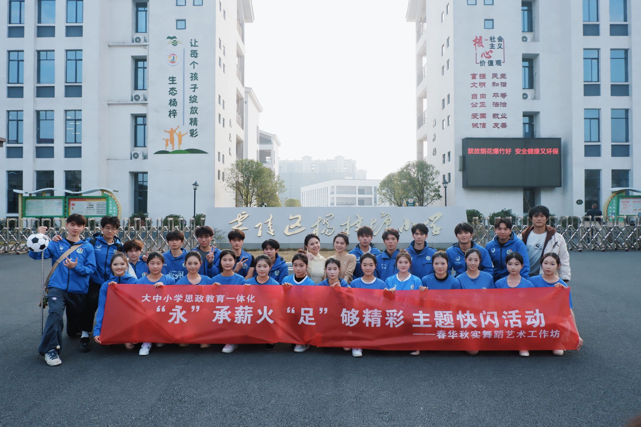 本网讯(通讯员 赵丹 余悦萌 倪昔瑶)2025年12月30日至31日,音乐与舞蹈学院春华秋实舞蹈艺术工作坊师生前往永州市零陵区杨梓塘小学、永州市第三中学,以“‘永’承薪火 ‘足’够精彩”为主题开展沉浸式思政艺术快闪活动。在15分钟的大课间里,师生们自编自导的原创节目,为四千余名中小学生呈现了一堂鲜活的创意思政课。