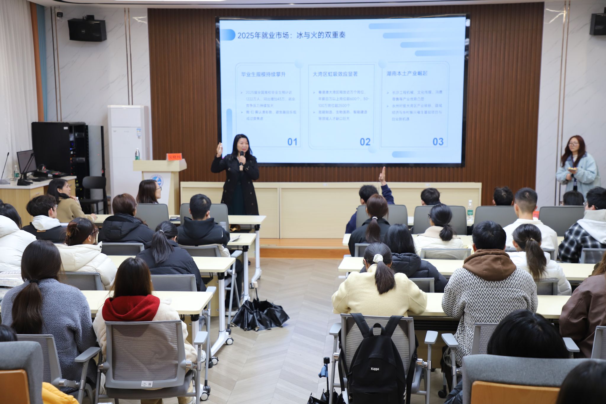 本网讯(通讯员 阮颖 彭丰香)3月20日晚,“从湘江到湾区的就业策略”主题讲座在明理楼101举行。活动特邀北京大学应用心理学硕士、深圳市艾普方略人力资源顾问有限公司联合创始人吴小纯担任主讲,百余名有实习、求职需求的同学参加。